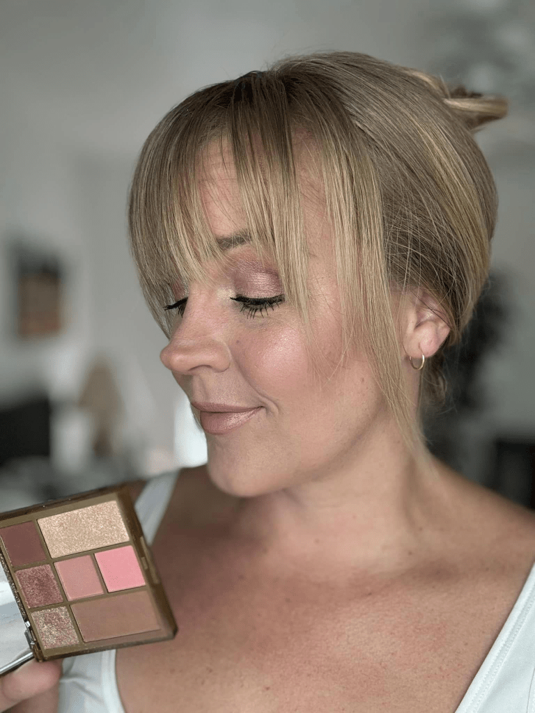 Step 2: Find an all in one palette. You don’t want to have to look for a million different products, and having them all in one place is a total WIN. Toss on a little contour (cheek bones breed tenacity), add in some blush (you’ll look energized even though your mom brain maybe feels like the undead), use your ring finger to tap some highlighter on your freshly contoured cheek bones (it aids the illusion), and add a rosie colored eye shadow look (Gen Z can’t talk shit if it isn’t beige).